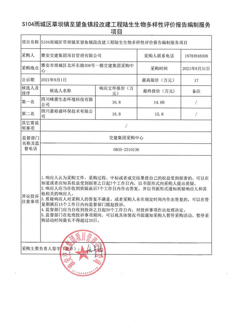 雅安交建集團(tuán)項(xiàng)目管理有限公司S104雨城區(qū)草壩鎮(zhèn)至望魚鎮(zhèn)段改建工程陸生生物多樣性評(píng)價(jià)報(bào)告編制服務(wù)項(xiàng)目評(píng)審結(jié)果公示