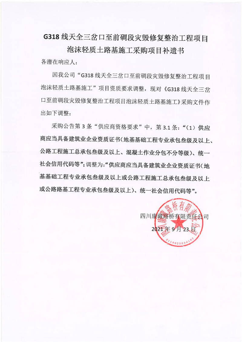 四川康藏路橋有限責(zé)任公司G318線天全三岔口至前碉段災(zāi)毀修復(fù)整治工程項目泡沫輕質(zhì)土路基施工采購項目補遺書