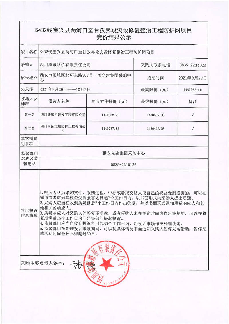 四川康藏路橋有限責(zé)任公司S432線寶興縣兩河口至甘孜界段災(zāi)毀修復(fù)整治工程防護(hù)網(wǎng)項(xiàng)目競(jìng)價(jià)結(jié)果公示