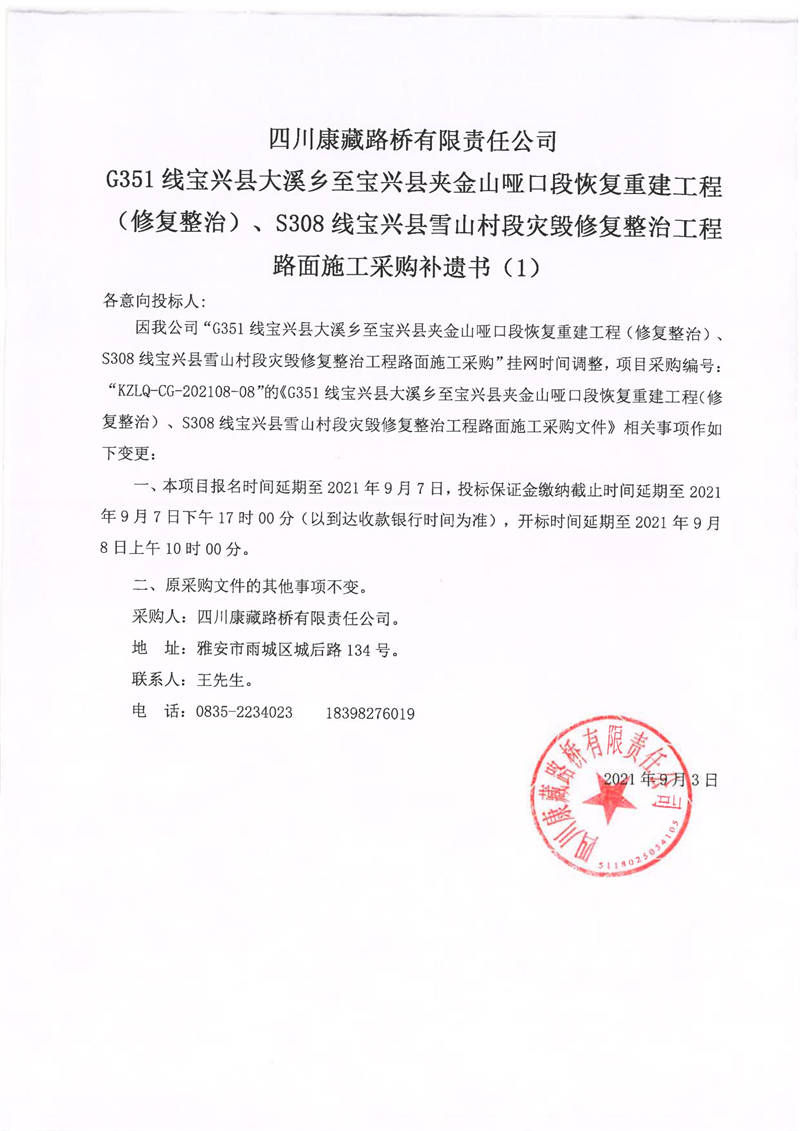 四川康藏路橋有限責(zé)任公司G351線寶興縣大溪鄉(xiāng)至寶興縣夾金山啞口段恢復(fù)重建工程(修復(fù)整治)、S308線寶興縣雪山村段災(zāi)毀修復(fù)整治工程路面施工采購(gòu)補(bǔ)遺書(shū)(1)
