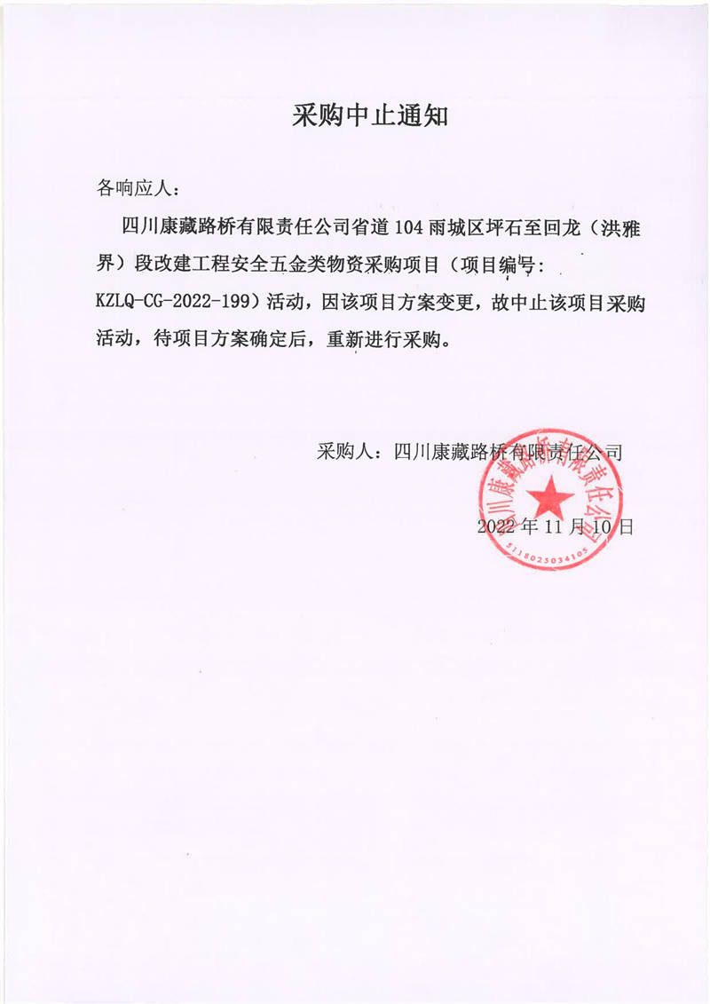 四川康藏路橋有限責(zé)任公司省道104雨城區(qū)坪石至回龍(洪雅界)段改建工程安全五金類物資采購項(xiàng)目采購中止通知