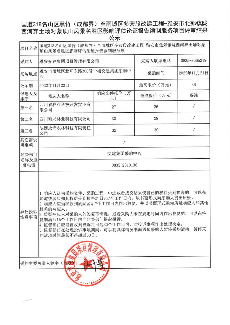 雅安交建集團項目管理有限公司國道318名山區(qū)黑竹(成都界)至雨城區(qū)多營段改建工程-雅安市北郊鎮(zhèn)隴西河棄土場對蒙頂山風景名勝區(qū)影響評估論證報告編制服務評審結果公示