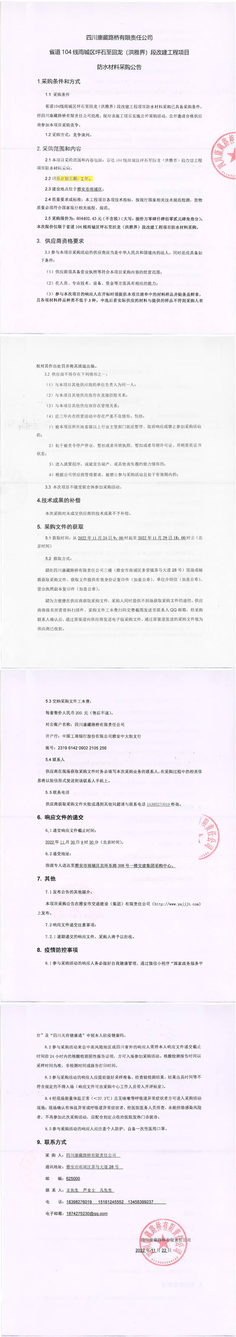 四川康藏路橋有限責(zé)任公司省道104雨城區(qū)坪石至回龍(洪雅界)段改建工程項目防水材料采購公告