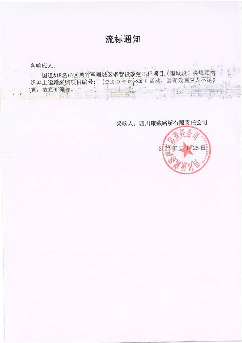 四川康藏路橋有限責(zé)任公司國道318名山區(qū)黑竹至雨城區(qū)多營(yíng)段改建工程項(xiàng)目(雨城段)尖峰頂隧道棄土運(yùn)輸采購項(xiàng)目流標(biāo)通知