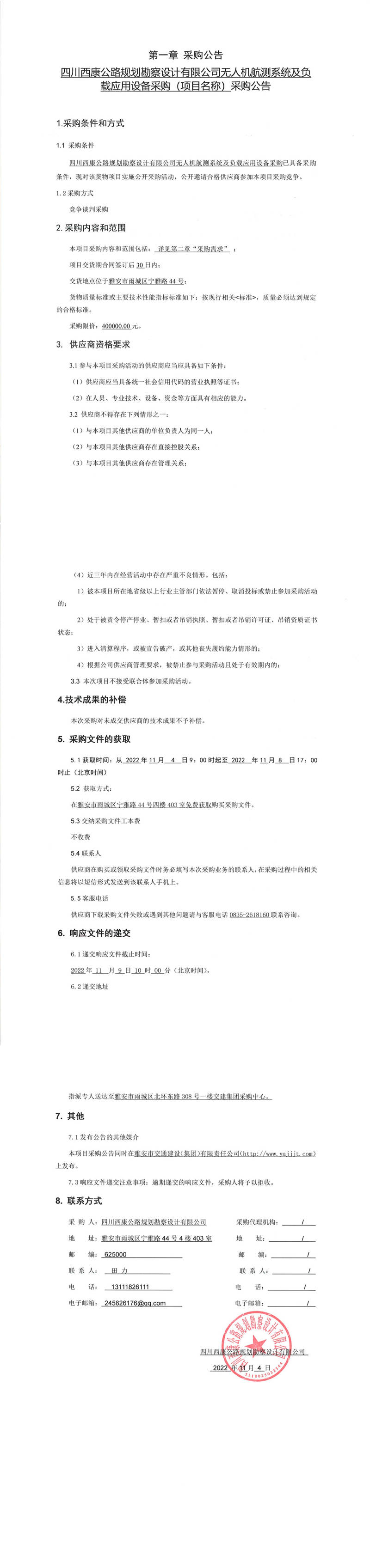 四川西康公路規(guī)劃勘察設計有限公司無人機航測系統(tǒng)及負載應用設備采購(項目名稱)采購公告