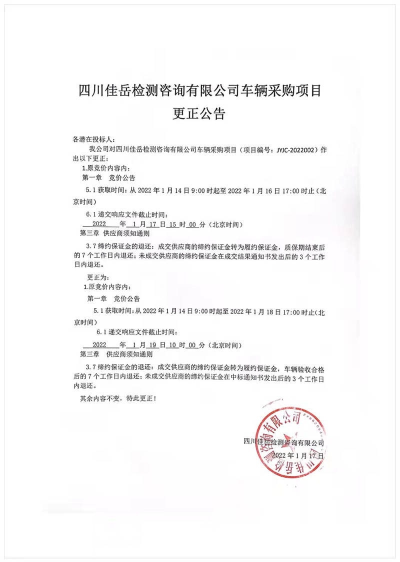 四川佳岳檢測咨詢有限公司車輛采購項(xiàng)目更正公告