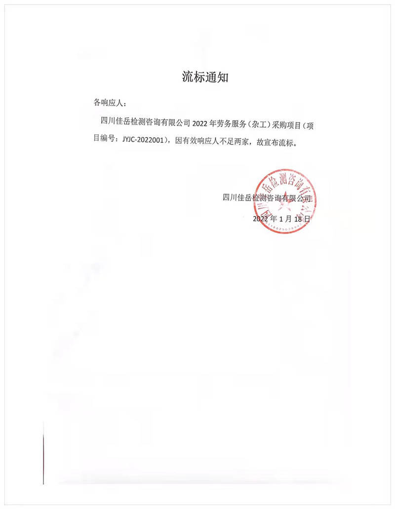 四川佳岳檢測咨詢有限公司2022年勞務(wù)服務(wù)(雜工)采購項目流標通知