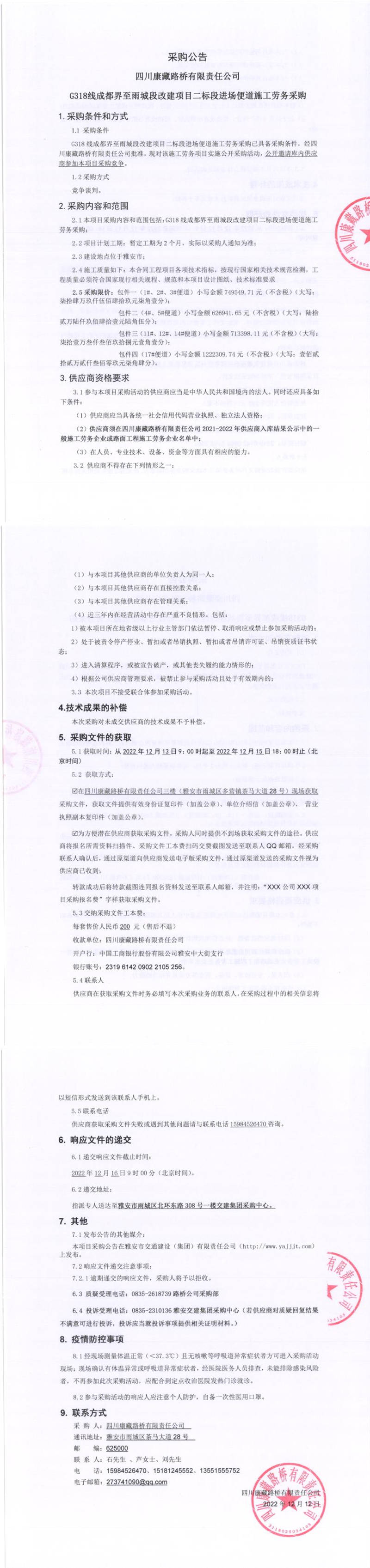 四川康藏路橋有限責任公司G318線成都界至雨城段新改建項目二標段進場便道施工勞務(wù)采購公告