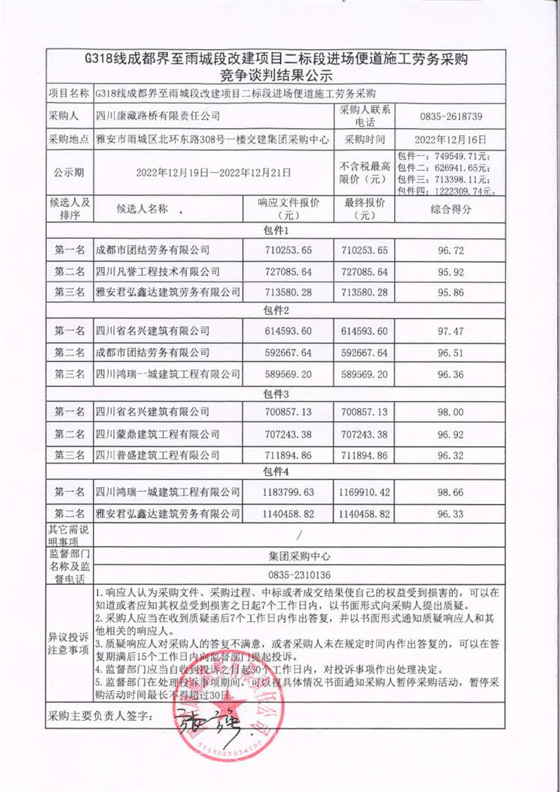 四川康藏路橋有限責任公司G318線成都界至雨城段改建項目二標段進場便道施工勞務(wù)采購競爭談判結(jié)果公示