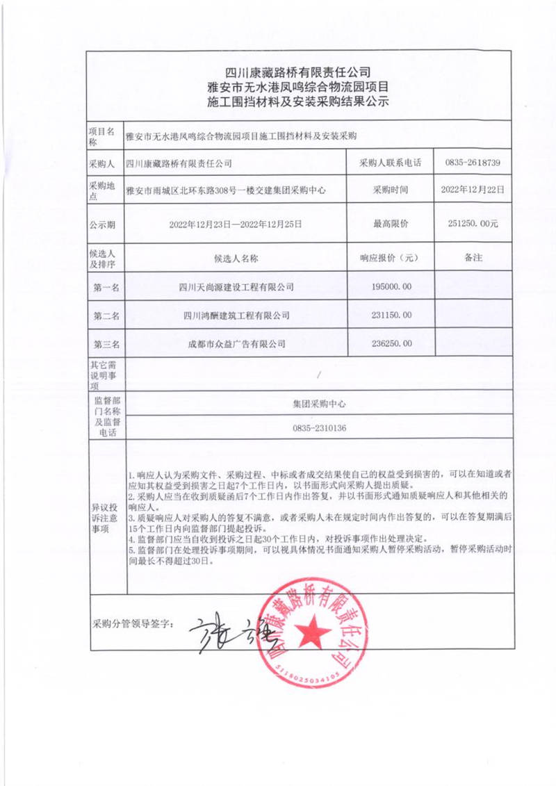 四川康藏路橋有限責(zé)任公司雅安市無水港鳳鳴綜合物流園項目施工圍擋材料及安裝采購結(jié)果公示