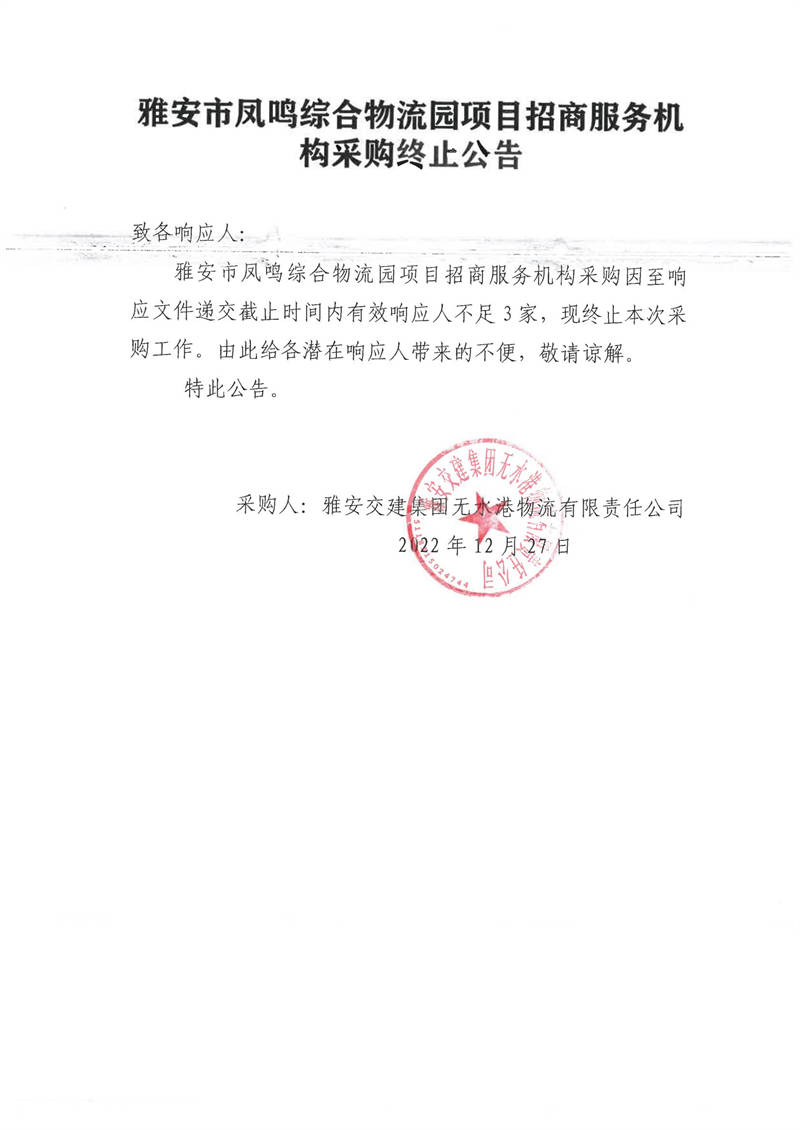 雅安交建集團(tuán)無水港物流有限責(zé)任公司雅安市鳳鳴綜合物流園項(xiàng)目招商服務(wù)機(jī)構(gòu)采購(gòu)終止公告
