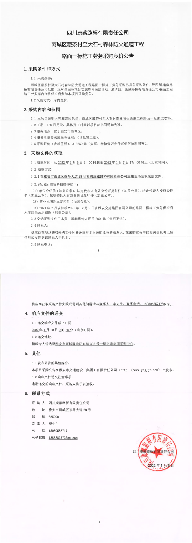 四川康藏路橋有限責(zé)任公司雨城區(qū)藏茶村至大石村森林防火通道工程路面一標(biāo)施工勞務(wù)采購競(jìng)價(jià)公告