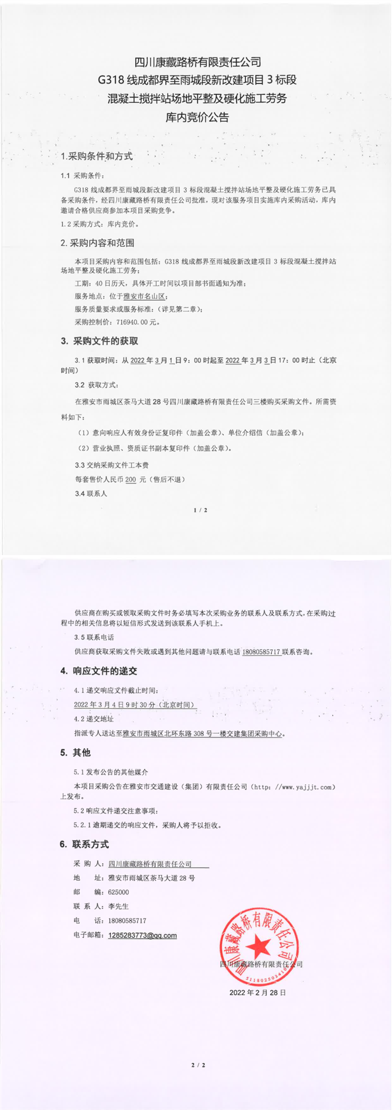 四川康藏路橋有限責(zé)任公司G318線成都界至雨城段新改建項目3標(biāo)段混凝土攪拌站場地平整及硬化施工勞務(wù)庫內(nèi)競價公告