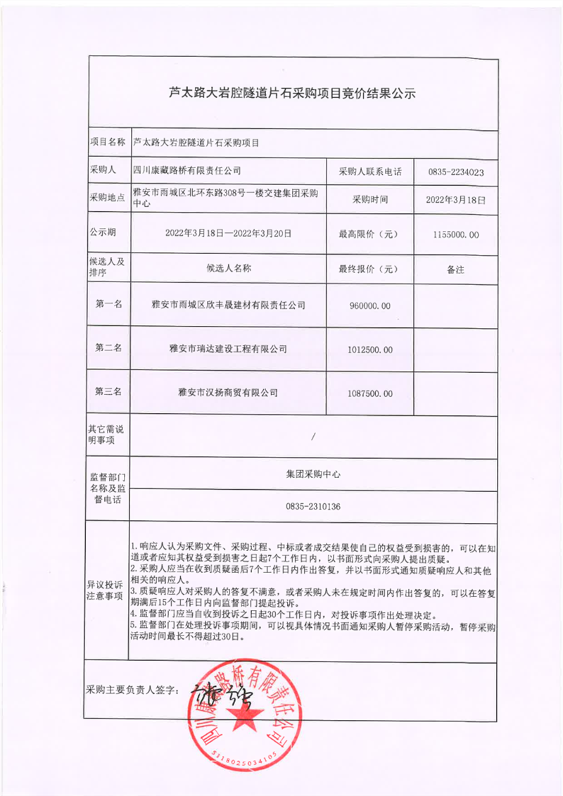 四川康藏路橋有限責任公司蘆太路大巖腔隧道片石采購項目競價結果公示