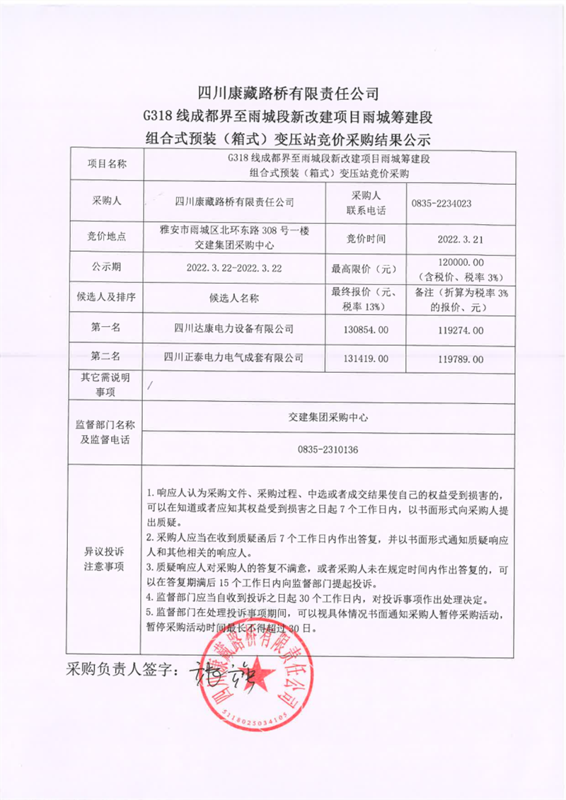 四川康藏路橋有限責任公司G318線成都界至雨城段新改建項目雨城籌建段組合式預裝(箱式)變壓站競價采購結果公示