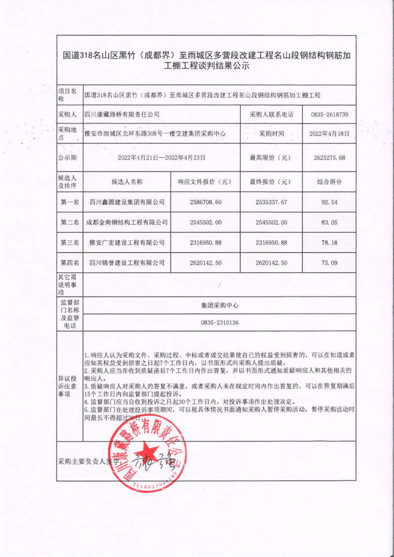四川康藏路橋有限責(zé)任公司國(guó)道318名山區(qū)黑竹(成都界)至雨城區(qū)多營(yíng)段改建工程名山段鋼結(jié)構(gòu)鋼筋加工棚工程談判結(jié)果公示