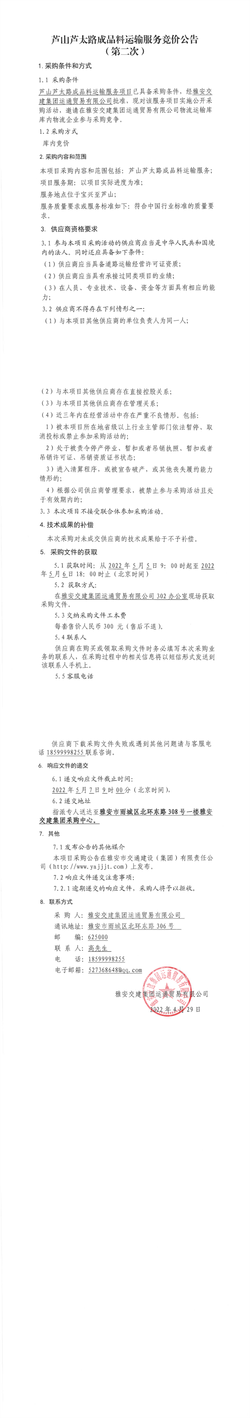 雅安交建集團(tuán)運(yùn)通貿(mào)易有限公司蘆山蘆太路成品料運(yùn)輸服務(wù)競價(jià)公告(第二次)