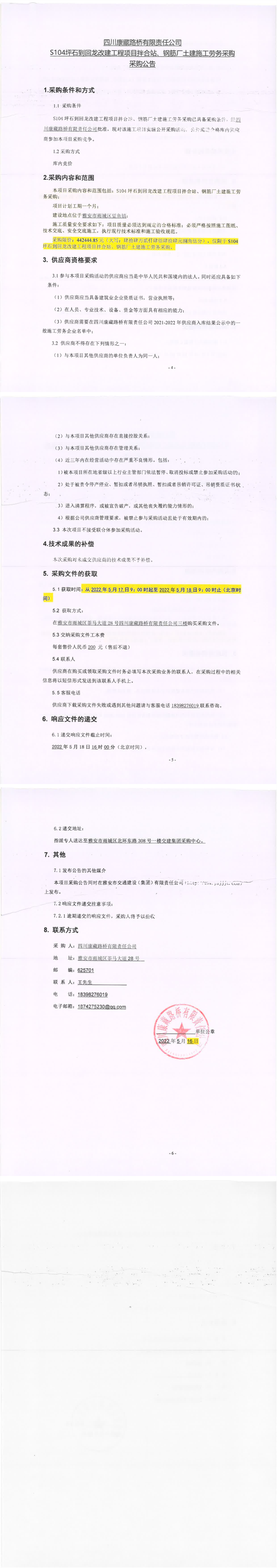 四川康藏路橋有限責(zé)任公司S104坪石到回龍改建工程項目拌合站、鋼筋廠土建施工勞務(wù)采購采購公告