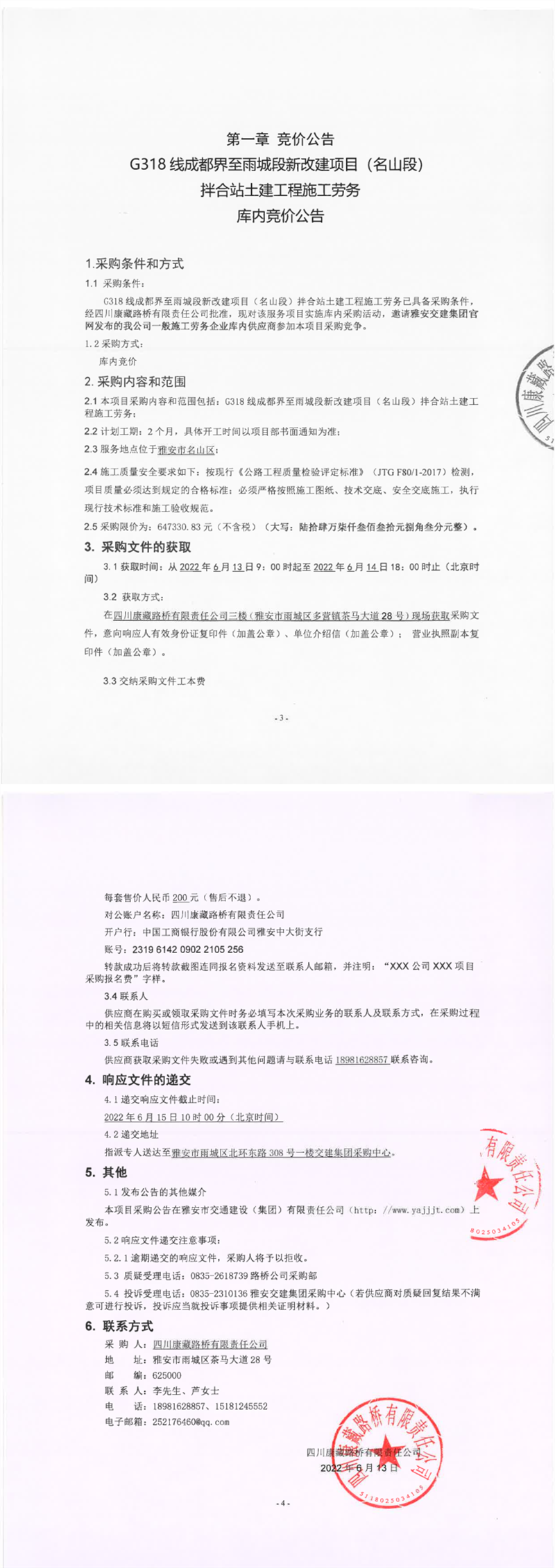 四川康藏路橋有限責任公司G318線成都界至雨城段新改建項目(名山段)拌合站土建工程施工勞務庫內(nèi)競價公告