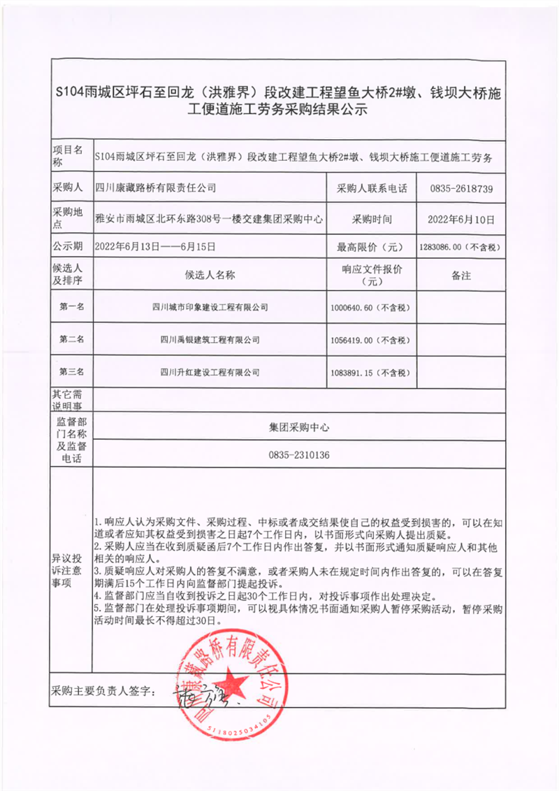四川康藏路橋有限責(zé)任公司S104雨城區(qū)坪石至回龍(洪雅界)段改建工程望魚大橋2#墩、錢壩大橋施工便道施工勞務(wù)采購結(jié)果公示
