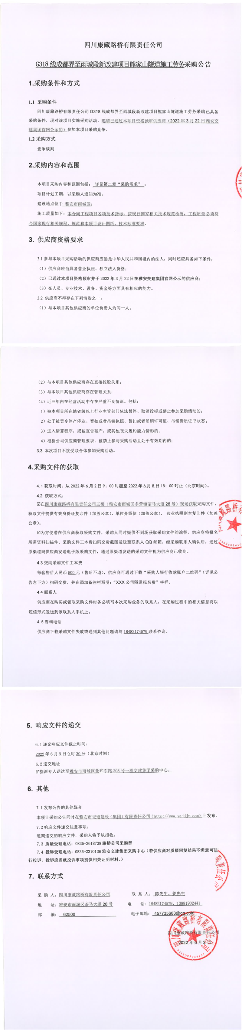 四川康藏路橋有限責(zé)任公司G318線成都界至雨城段新改建項(xiàng)目熊家山隧道施工勞務(wù)采購(gòu)公告