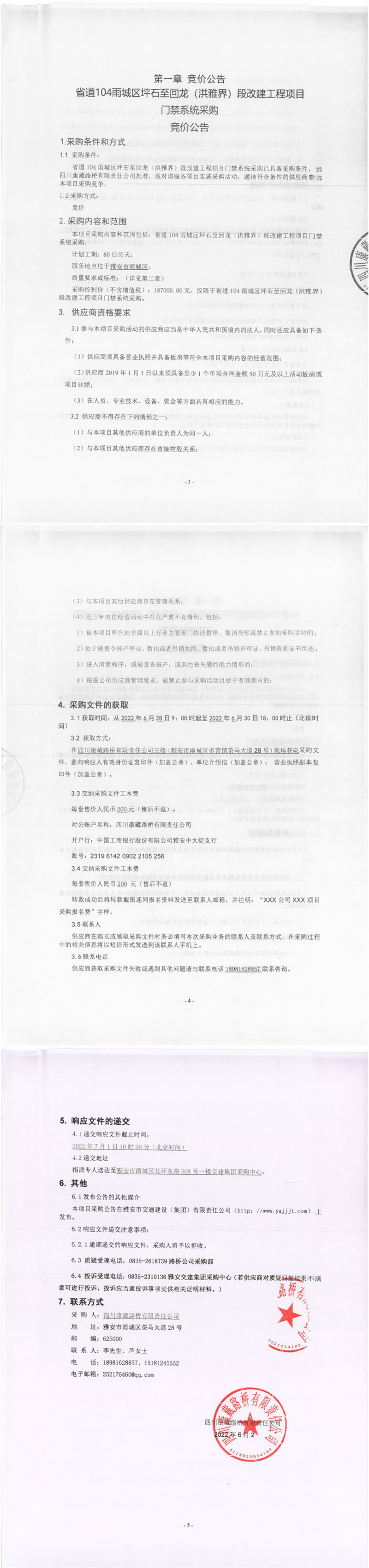 四川康藏路橋有限責任公司省道104雨城區(qū)坪石至回龍(洪雅界)段改建工程項目門禁系統(tǒng)采購