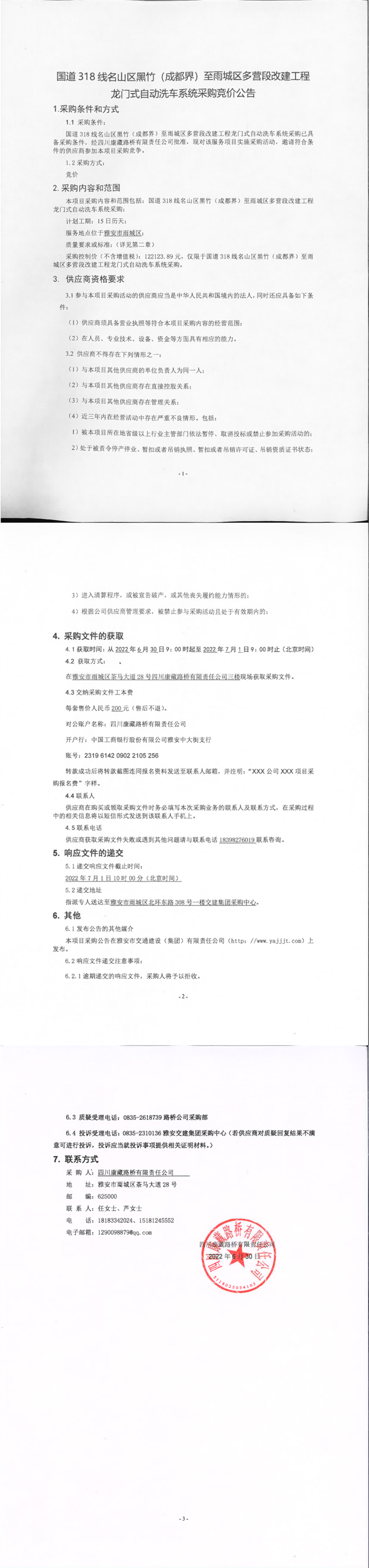 四川康藏路橋有限責(zé)任公司國(guó)道318名山區(qū)黑竹(成都界)至雨城區(qū)多營(yíng)段改建工程龍門(mén)式自動(dòng)洗車(chē)系統(tǒng)采購(gòu)競(jìng)價(jià)公告