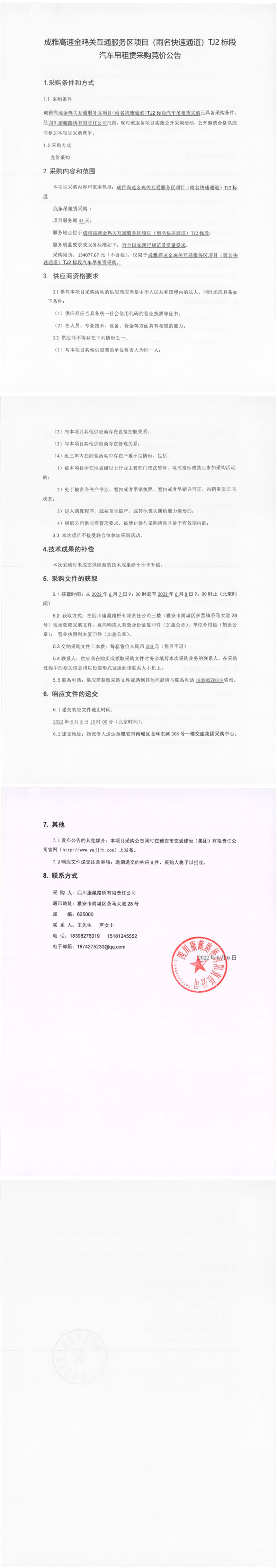 四川康藏路橋有限責任公司成雅高速金雞關(guān)互通服務區(qū)項目(雨名快速通道)TJ2標段汽車吊租賃采購競價公告