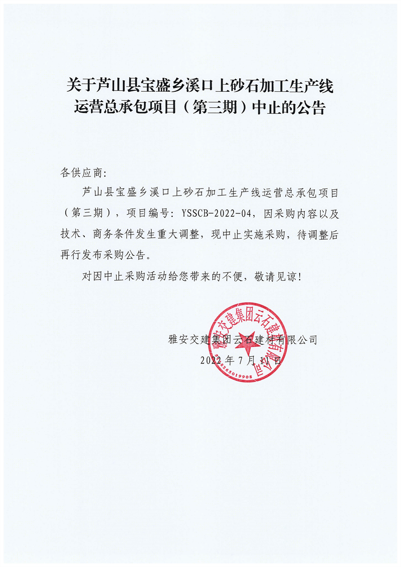 雅安交建集團云石建材有限公司關于蘆山縣寶盛鄉(xiāng)溪口上砂石加工生產線運營總承包項目(第三期)中止的公告