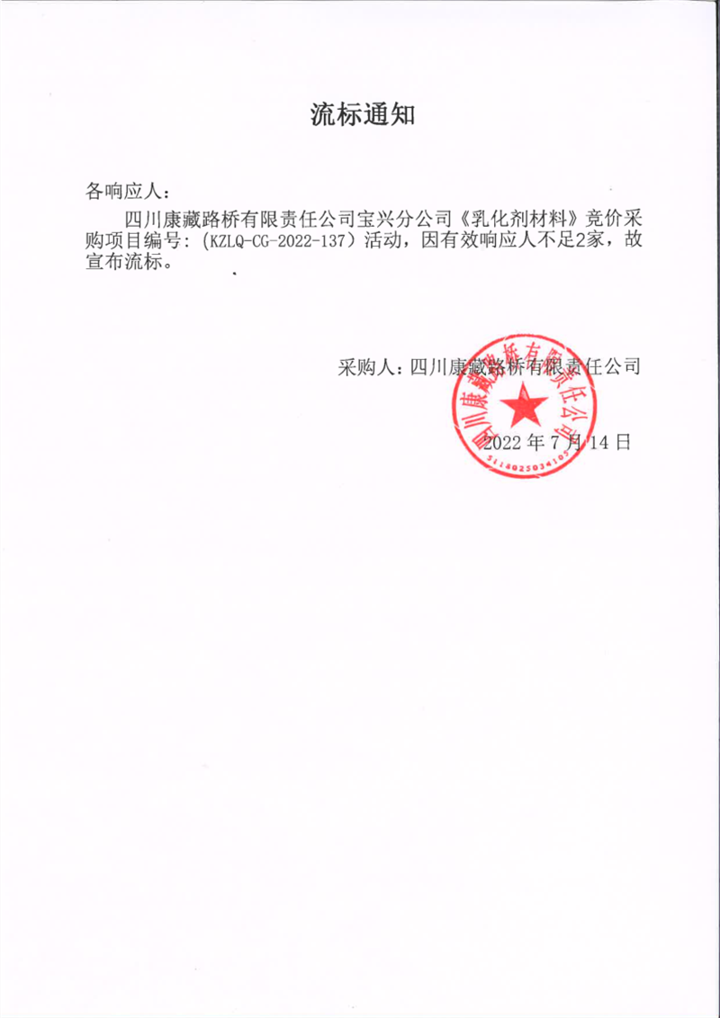 四川康藏路橋有限責任公司寶興分公司乳化劑材料采購流標通知