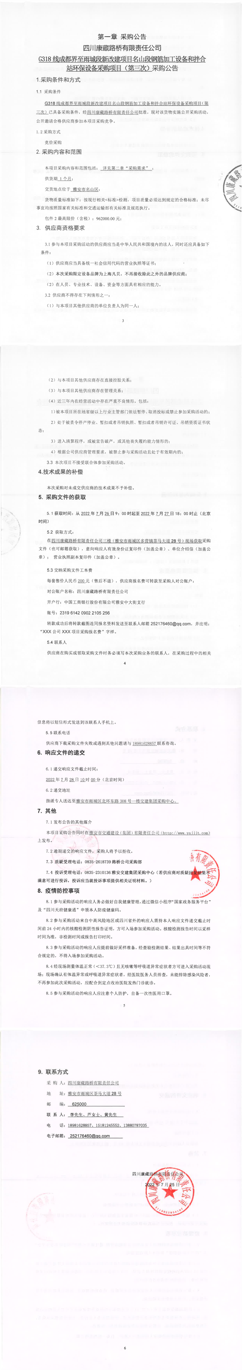 四川康藏路橋有限責(zé)任公司G318線成都界至雨城段新改建項(xiàng)目名山段鋼筋加工設(shè)備和拌合站環(huán)保設(shè)備采購(gòu)項(xiàng)目(第三次)采購(gòu)公告