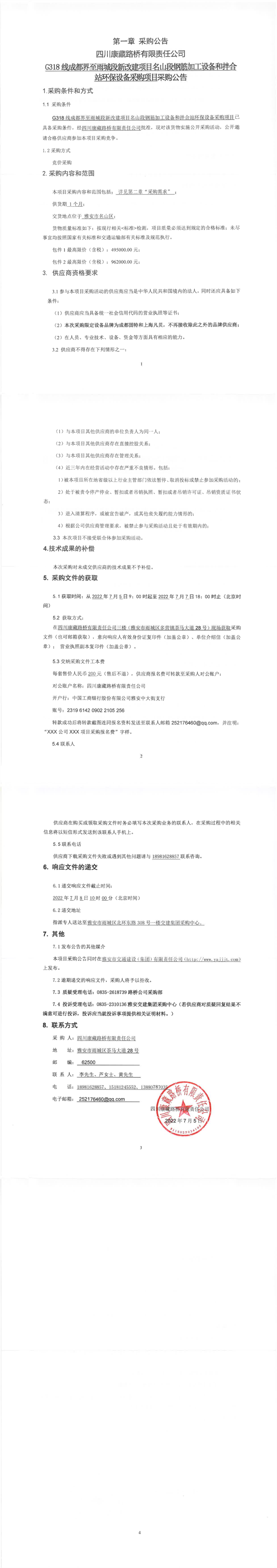 四川康藏路橋有限責(zé)任公司G318線成都界至雨城段新改建項(xiàng)目名山段鋼筋加工設(shè)備和拌合站環(huán)保設(shè)備采購項(xiàng)目采購公告