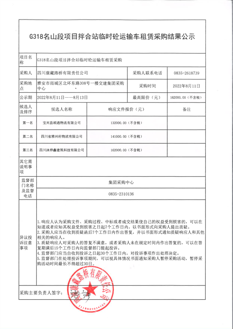 四川康藏路橋有限責(zé)任公司G318名山段項目拌合站臨時砼運輸車租賃采購結(jié)果公示