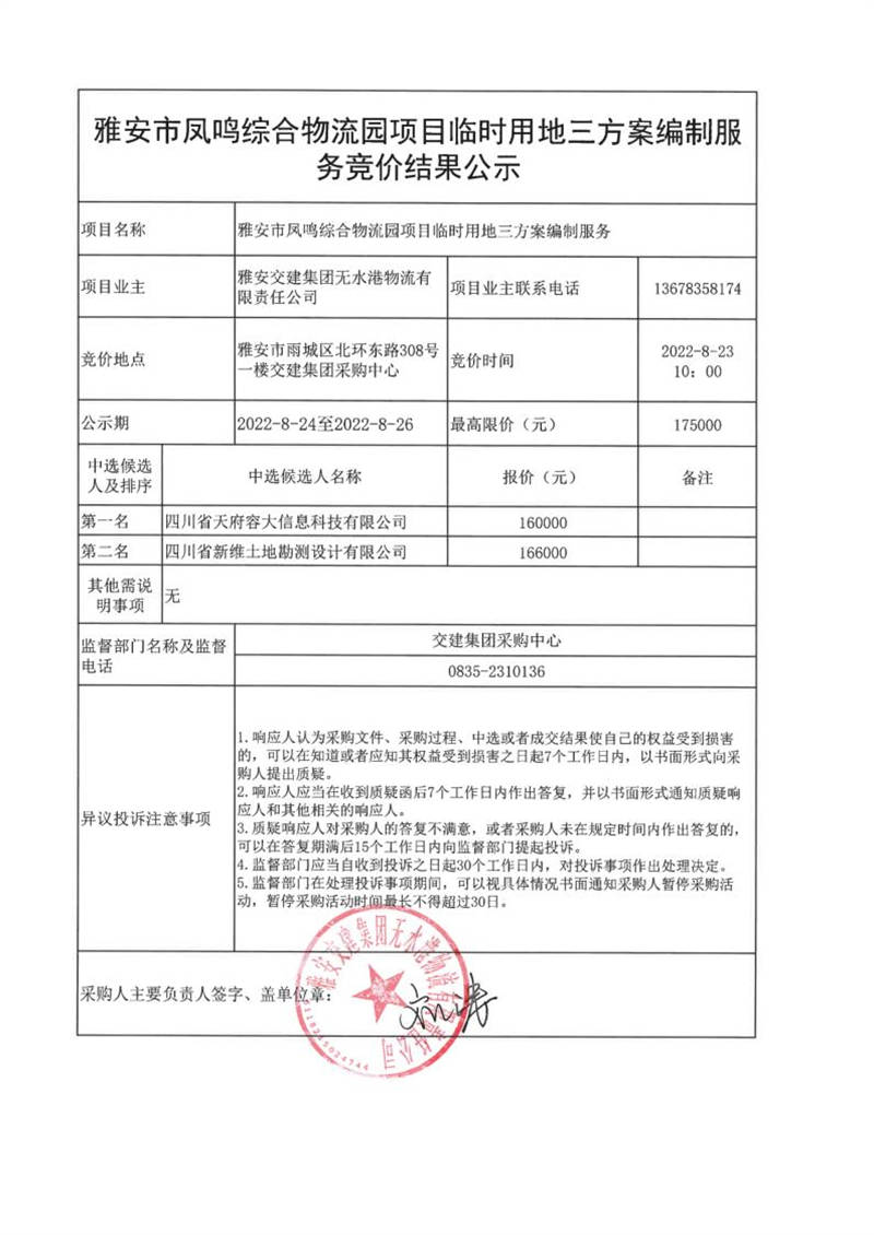 雅安交建集團(tuán)無水港物流有限責(zé)任公司雅安市鳳鳴綜合物流園項(xiàng)目臨時用地三方案編制服務(wù)競價結(jié)果公示