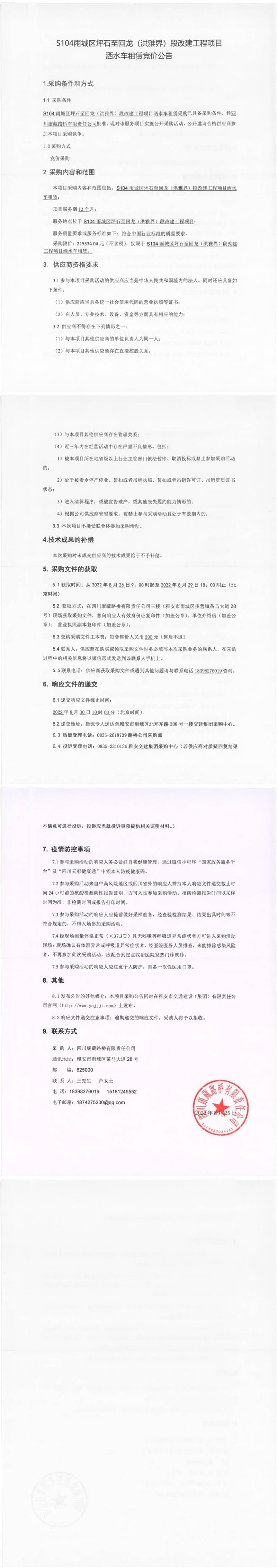四川康藏路橋有限責(zé)任公司S104雨城區(qū)坪石至回龍(洪雅界)段改建工程項(xiàng)目灑水車租賃競(jìng)價(jià)公告