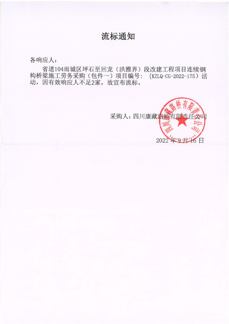 四川康藏路橋有限責(zé)任公司省道104雨城區(qū)坪石至回龍(洪雅界)段改建工程項(xiàng)目連續(xù)鋼構(gòu)橋梁施工勞務(wù)采購(gòu)(包件一)流標(biāo)通知