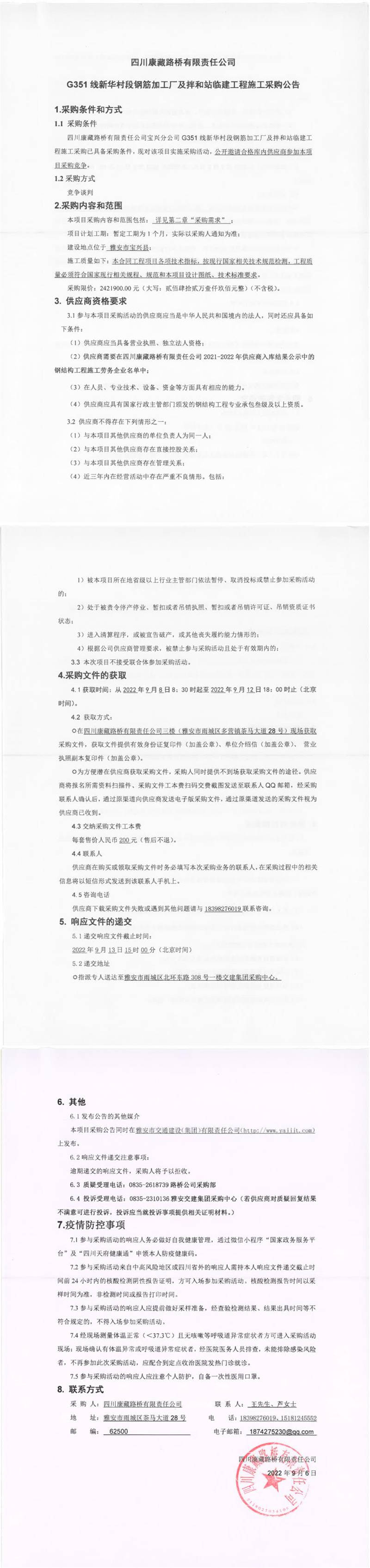 四川康藏路橋有限責(zé)任公司G351線(xiàn)新華村段鋼筋加工廠(chǎng)及拌和站臨建工程施工采購(gòu)公告