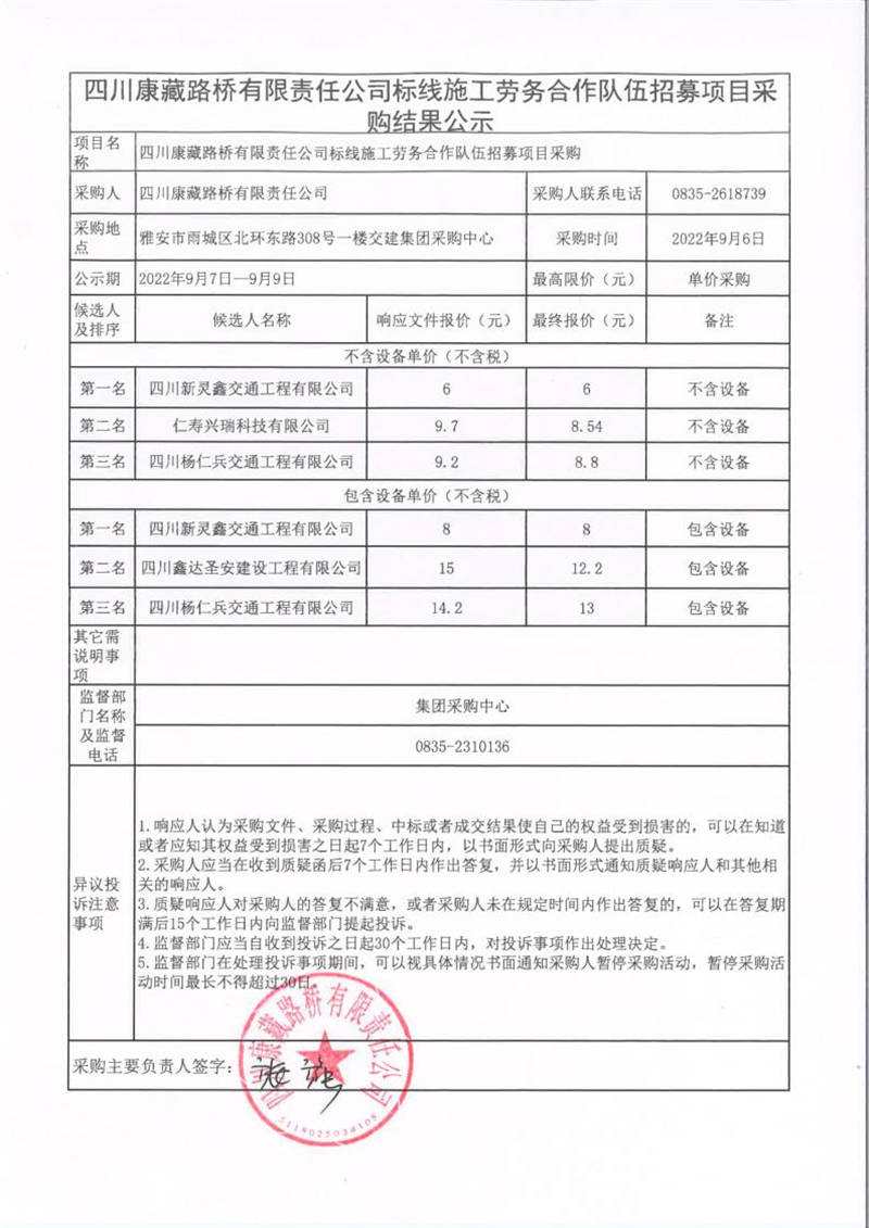 四川康藏路橋有限責(zé)任公司標(biāo)線施工勞務(wù)合作隊(duì)伍招募項(xiàng)目采購結(jié)果公示