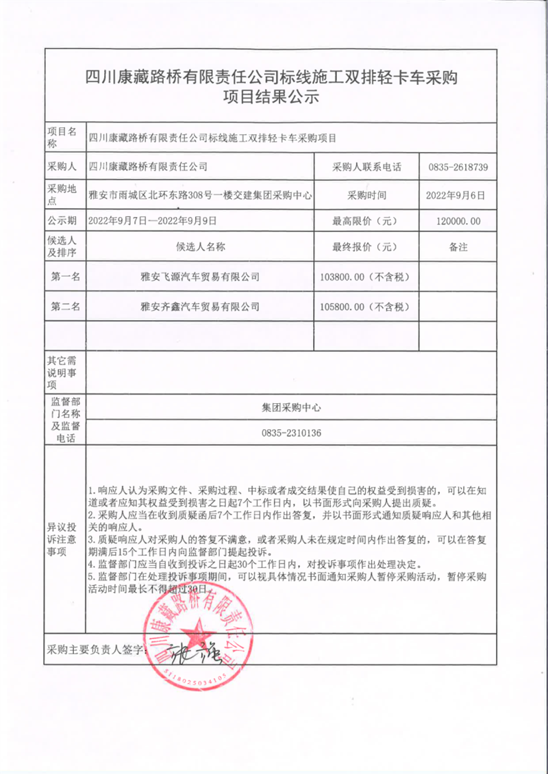 四川康藏路橋有限責任公司標線施工雙排輕卡車采購項目結果公示