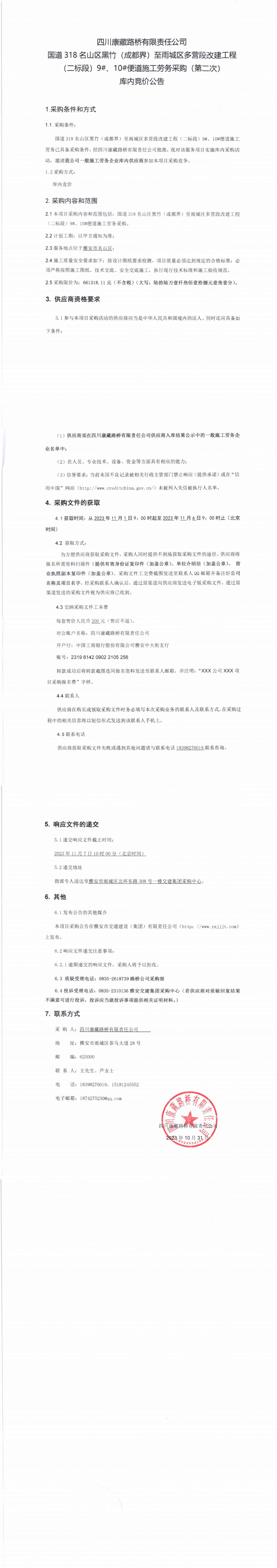 四川康藏路橋有限責(zé)任公司國道318名山區(qū)黑竹(成都界)至雨城區(qū)多營段改建工程(二標(biāo)段)9#、10#便道施工勞務(wù)采購(第二次)庫內(nèi)競價公告