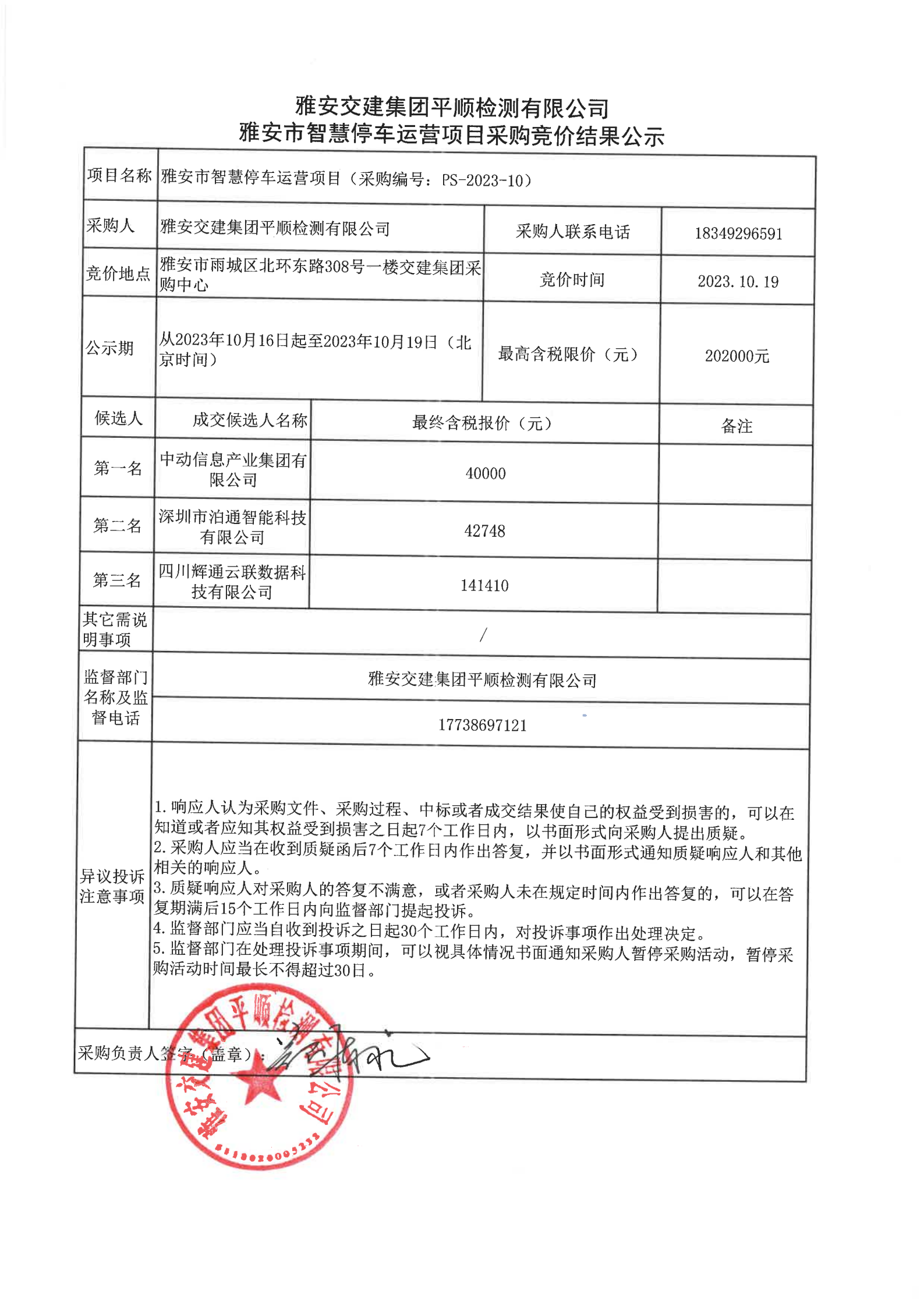 雅安交建集團(tuán)平順檢測(cè)有限公司雅安市智慧停車運(yùn)營(yíng)項(xiàng)目采購(gòu)競(jìng)價(jià)結(jié)果公示