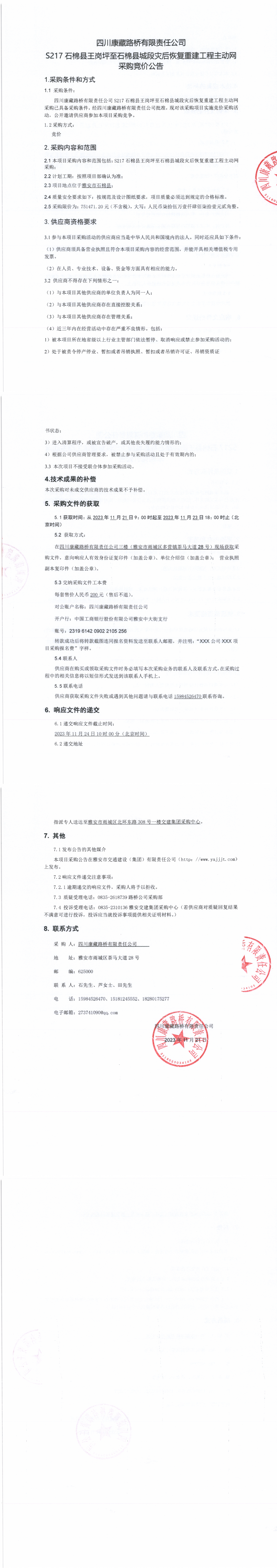 四川康藏路橋有限責(zé)任公司S217石棉縣王崗坪至石棉縣城段災(zāi)后恢復(fù)重建工程主動(dòng)網(wǎng)采購(gòu)公告
