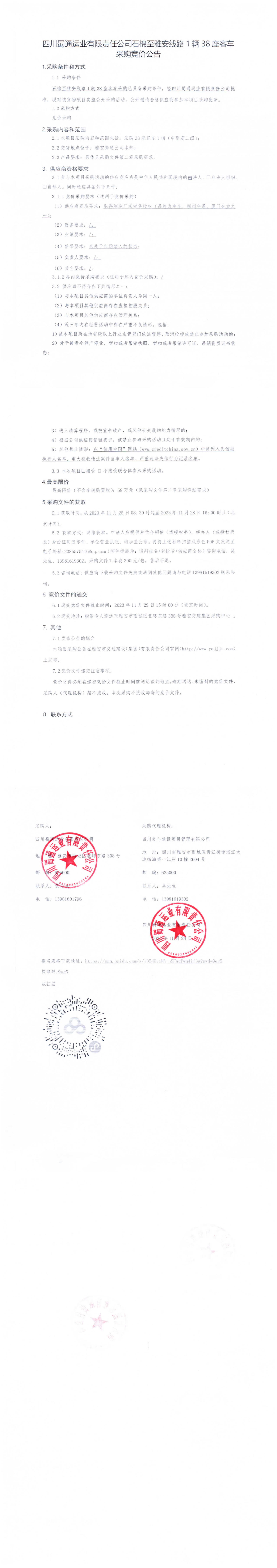 四川蜀通運(yùn)業(yè)有限責(zé)任公司石棉縣至雅安線路1輛38座客車采購競價(jià)公告