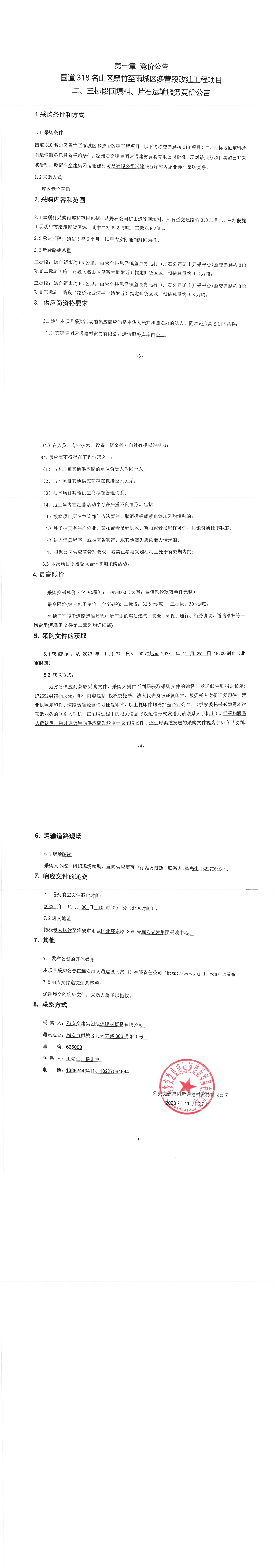 交建集團(tuán)運(yùn)通建材貿(mào)易有限公司國(guó)道318名山區(qū)黑竹至雨城區(qū)多營(yíng)段改建工程項(xiàng)目二、三標(biāo)段回填料、片石運(yùn)輸服務(wù)競(jìng)價(jià)公告
