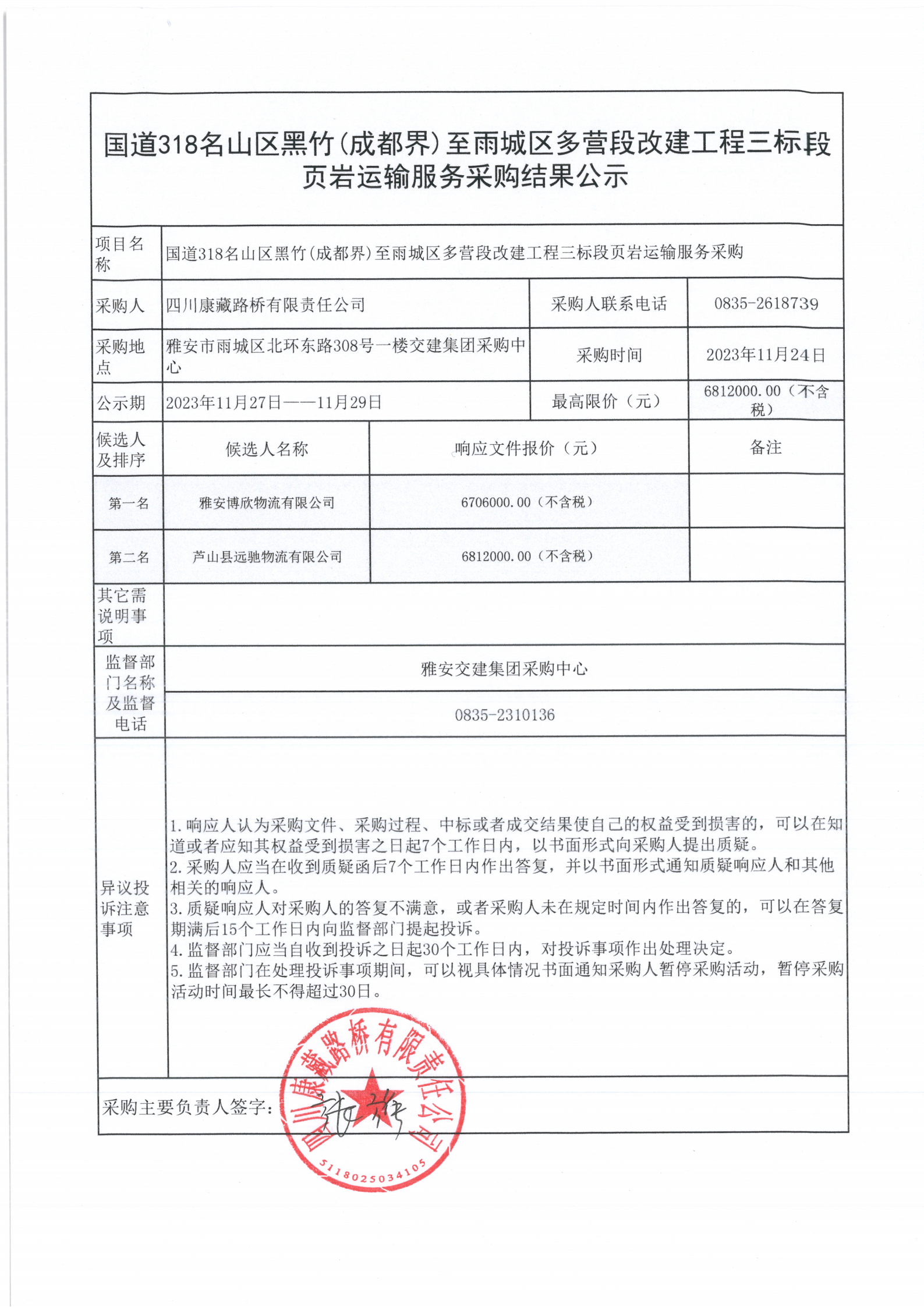 四川康藏路橋有限責(zé)任公司國道318名山區(qū)黑竹(成都界)至雨城區(qū)多營段改建工程三標(biāo)段頁巖運輸服務(wù)采購結(jié)果公示