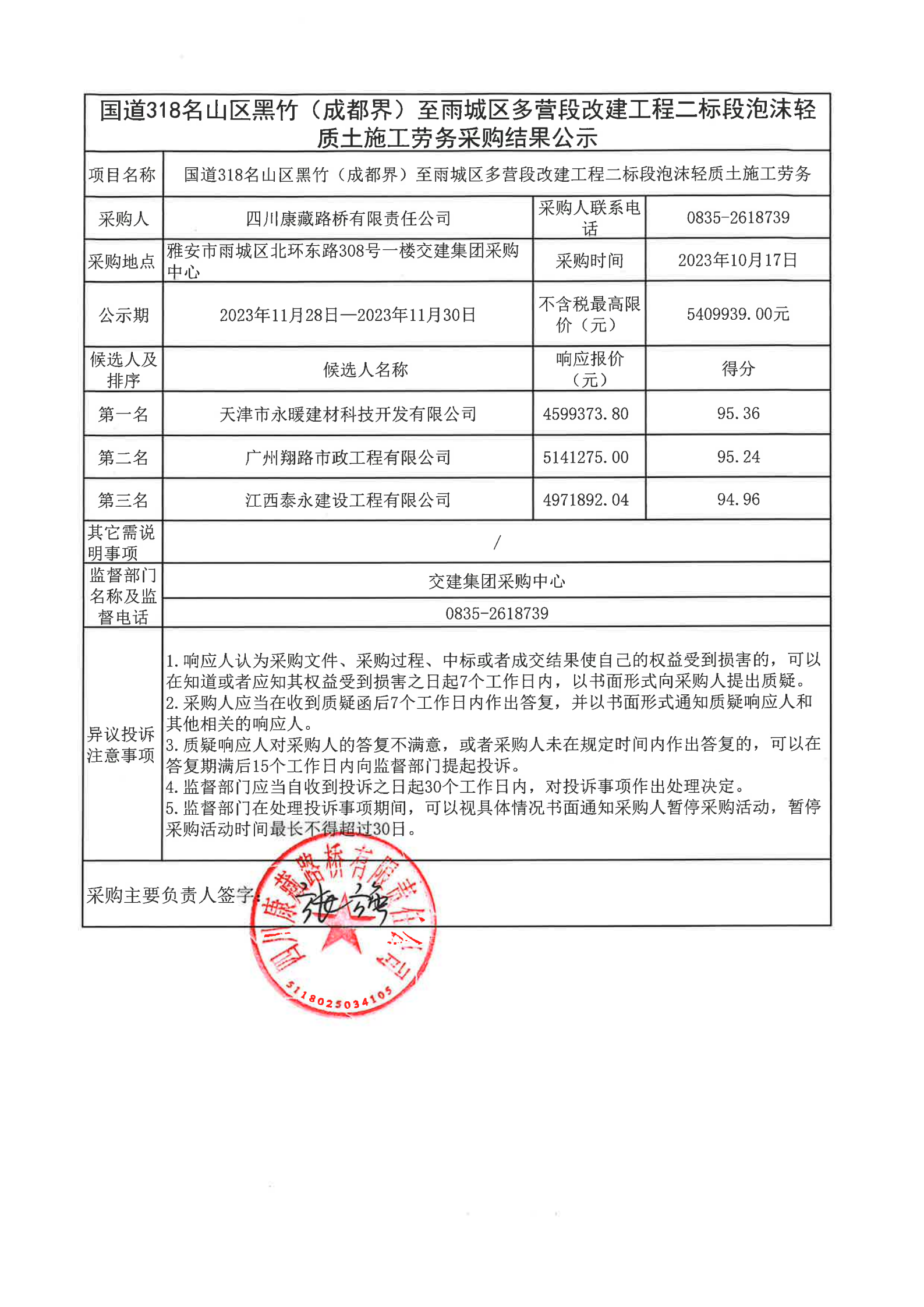 四川康藏路橋有限責(zé)任公司國道318名山區(qū)黑竹(成都界)至雨城區(qū)多營段改建工程二標(biāo)段泡沫輕質(zhì)土施工勞務(wù)采購結(jié)果公示