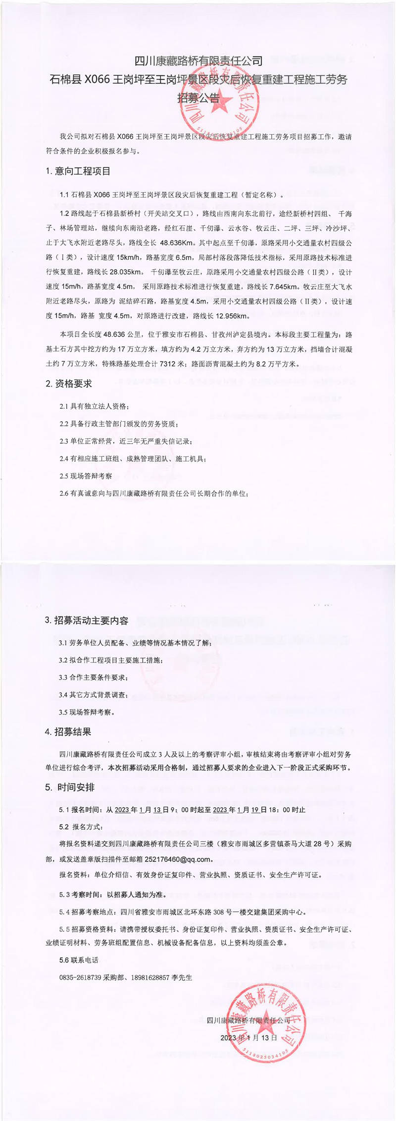 四川康藏路橋有限責任公司石棉縣X066王崗坪至王崗坪景區(qū)段災(zāi)后恢復(fù)重建工程施工勞務(wù)招募公告