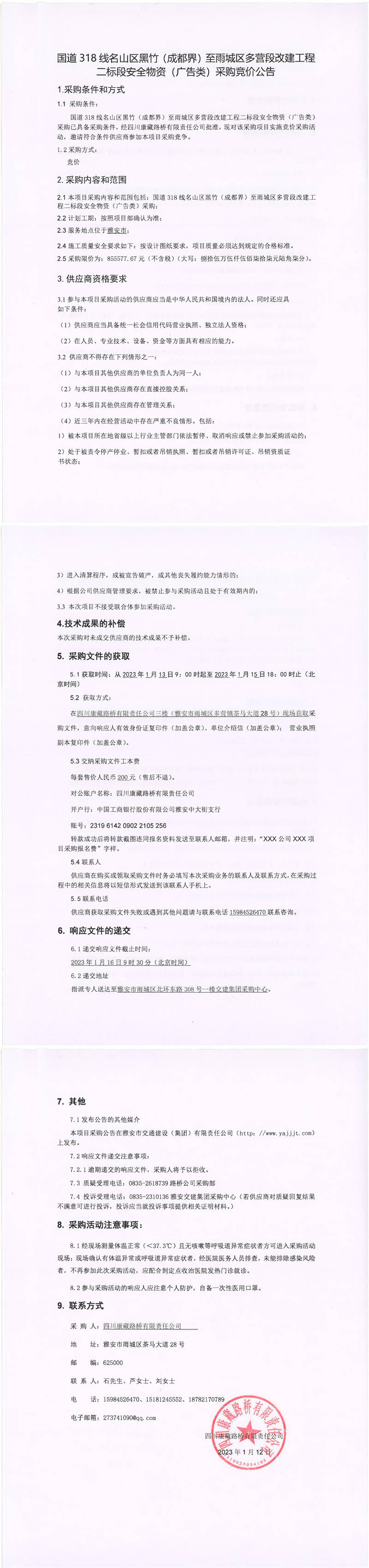 四川康藏路橋有限責任公司國道318線名山區(qū)黑竹(成都界)至雨城區(qū)多營段改建工程二標段安全物資(廣告類)采購競價公告