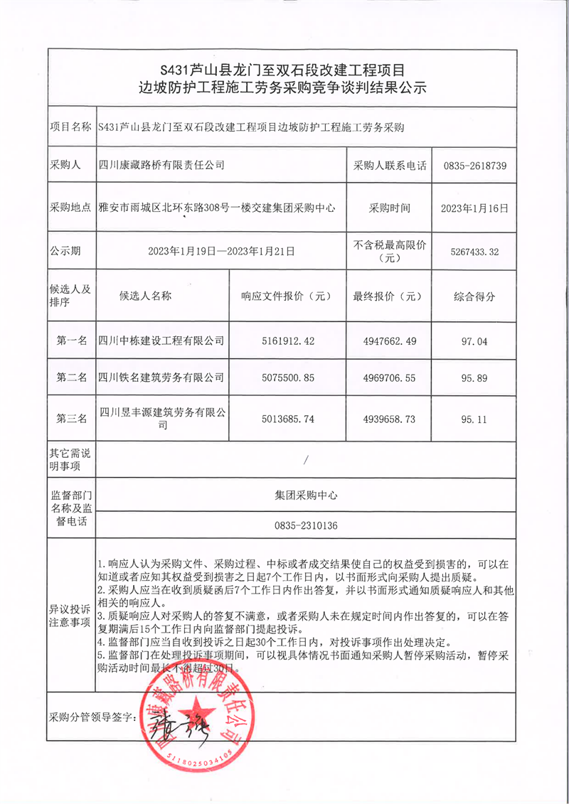 四川康藏路橋有限責(zé)任公司S431蘆山縣龍門至雙石段改建工程項(xiàng)目邊坡防護(hù)工程施工勞務(wù)采購競爭談判結(jié)果公示