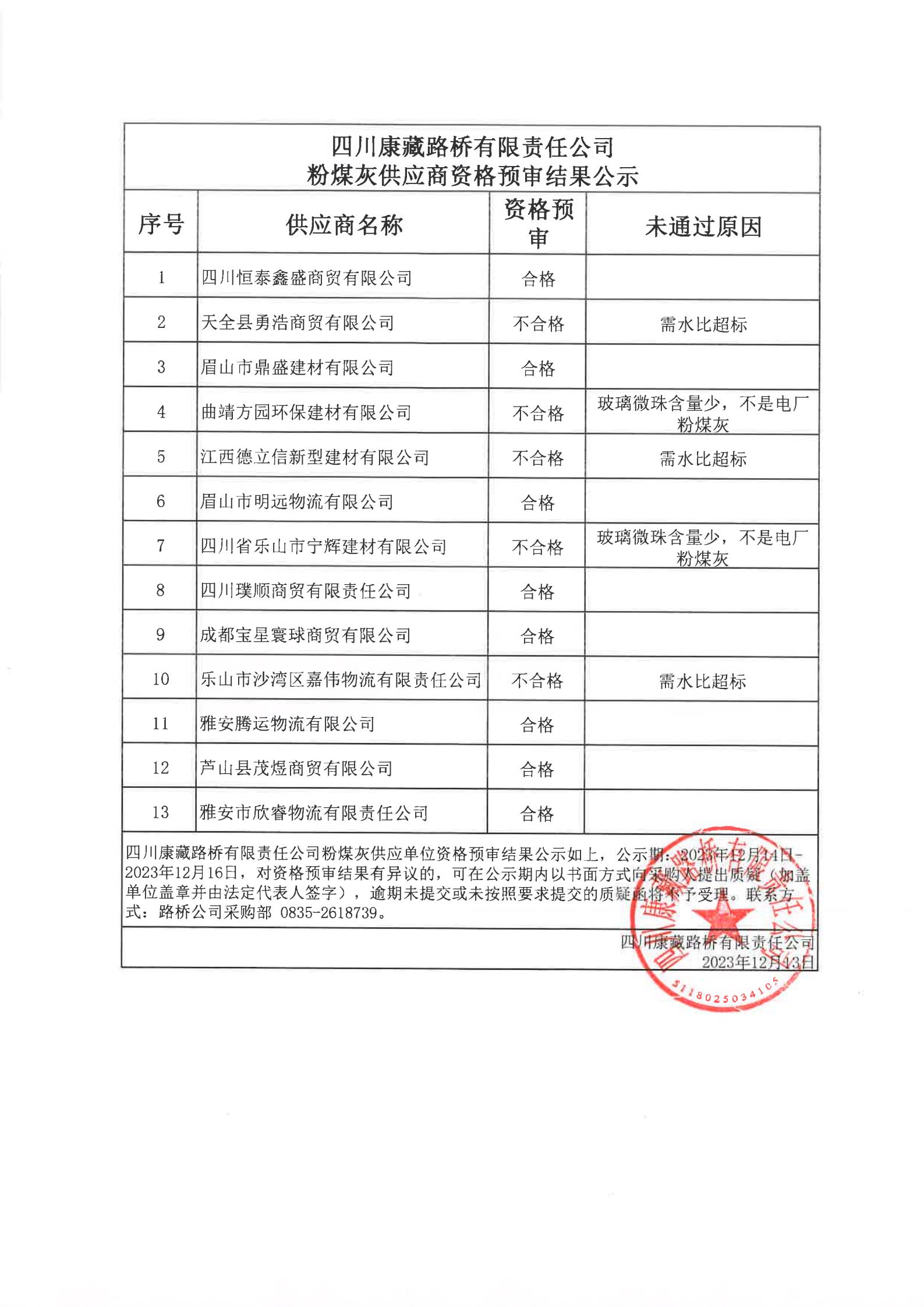 四川康藏路橋有限責任公司粉煤灰供應(yīng)商資格預審結(jié)果公示